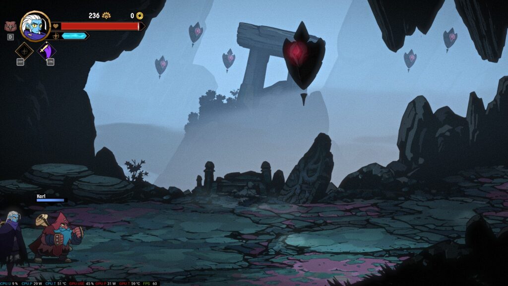Karl is the dwarven bruiser. He’s all muscle, knuckles, and attitude. His playstyle is close, risky, and deeply satisfying when you nail that parry-punch combo that clears half the screen.