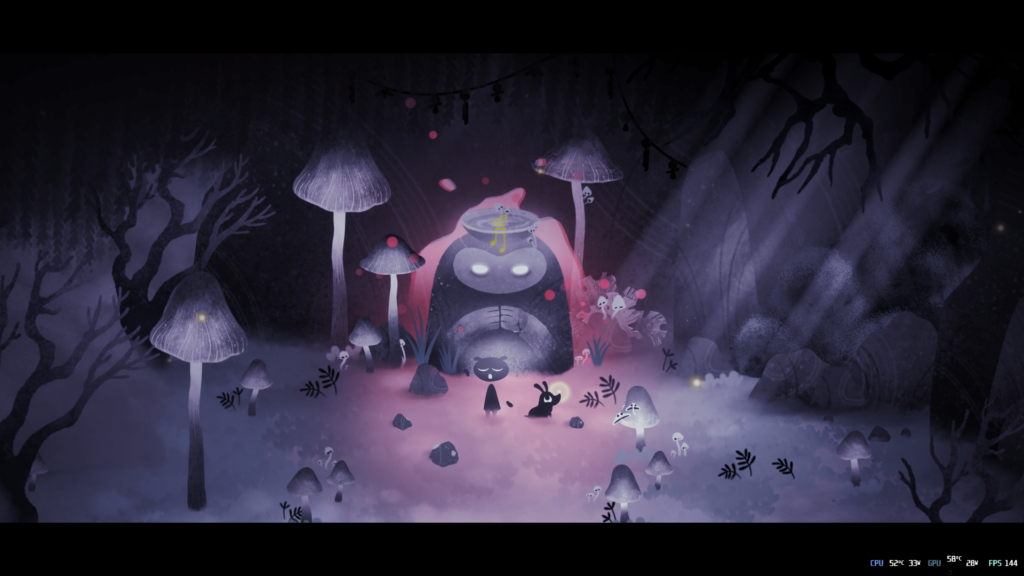 Visually, Koira is absolutely beautiful. Every frame looks like it could be a piece of concept art. The entire game is hand-drawn, with rich colors and soft animations that breathe life into the forest. Early on, the palette is peaceful and warm sunlight pouring through trees, birds chirping, everything feeling safe and natural. But as the story unfolds and danger creeps in, those visuals shift. The world gets colder. More shadows. Harsher light. It’s subtle but deliberate, and the game uses this evolution to tell its story visually, without ever needing text.