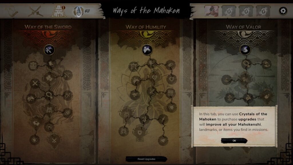 Mahokenshi has these Mahoken crystals that let you select one permanent attribute, like starting a map with initial gold, or option to heal yourself at village markets at the cost of your energy etc. Although, I wish we had a skill tree like those RPGs, because our four characters are fixed. The more we play using them, the more they level up, thus, unlocking starting equipment that can increase your base stats. True, decision-making is still there as in which equipment you need to take, but it would have been even more engaging had there been a skill tree.