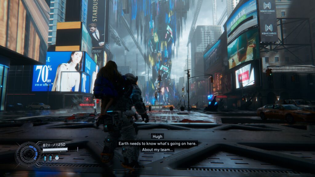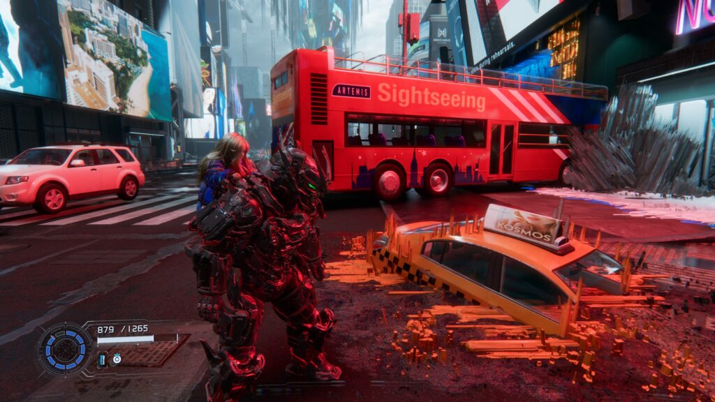 Let’s talk about how this game looks, because it demands to be talked about. Pragmata is, without qualification, one of the best-looking games of this generation. The art direction — clean, grounded, NASA-plausible sci-fi interspersed with the deeply wrong geometry of an AI-hallucinated cityscape — is genuinely extraordinary. Taxis sinking into lunar floors. Buses extruding from walls at impossible angles. A Manhattan that doesn’t quite know it’s wrong. Capcom’s human developers painstakingly hand-crafted every distortion, and the result is something that sits in your memory long after you’ve put the controller down.