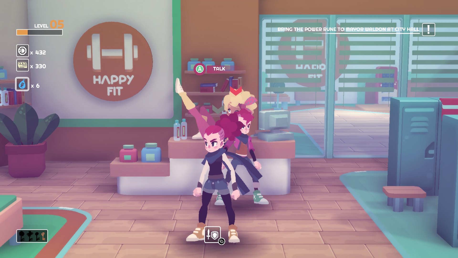 Although despite having good character customization Young Souls features a weird levelling up experience is earned in same old fashioned way by killing enemies but order to level up you need to go back to you need to go to your bedroom to sleep to gain a level and every time you gain 2 levels above you get a healthy token which can be used in a gym to do some exercise and improve your stats.